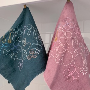 →リネンは乾きがとても早い素材ですので、洗った後のお皿を拭いたりした後、斜めに1つまみで干してもすぐに乾きます。(バスタオルを干す時のようにいっぱいに広げなくても大丈夫なのが便利なところです!) 衛生上、一度使えば洗いたい方も、その場で石鹸などでパーっと洗ってそのまま干しても、ギュッとしぼってパンパンと叩いて干せば半日もすれば乾いています。(洗った後の食器を拭くくらいでしたらそうそう汚れることもないとは思いますが、何らかのハプニングで洗って取れないような汚れが付いてしまった場合は…私ならそこにも刺繍をしてごまかしてしまいます!)